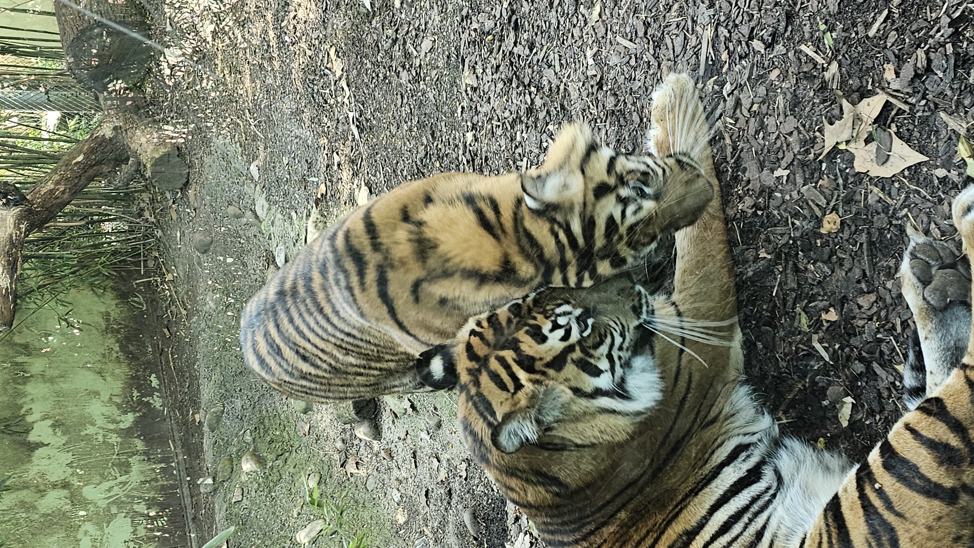 Two striped tigers are depicted within an outdoor enclosure at the Zoologischer Garten Frankfurt am Main (Frankfurt Zoo), Frankfurt, Germany. One large tiger is partially visible, lying on the ground in the lower left of the frame, its head positioned towards the upper left. This tiger displays characteristic orange and black stripes, with prominent white fur on its face, chin, and inner ears. A second tiger, smaller in stature, stands over the first, with its body extending from the upper center down to the lower right. Its head is lowered towards the face and neck of the reclining tiger, indicating close interaction, possibly nuzzling or play. The ground consists of dark soil mixed with wood chips and scattered dry leaves. Small rocks are visible throughout the foreground. In the background, a light green, mottled wall or barrier is present on the left. To the right, a dense cluster of bamboo stalks and a large, fallen wooden log or branch are discernible, partially obscured by a faint wire mesh or fence structure.