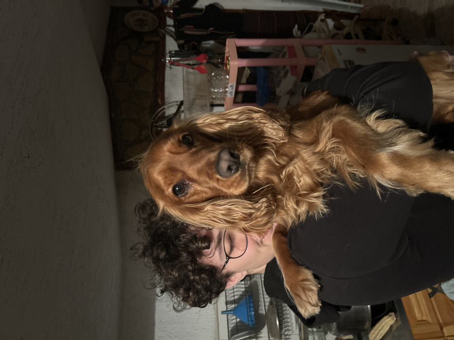 An individual with dark, curly hair and round eyeglasses, wearing a black long-sleeved garment, is depicted holding a medium-sized dog identified as a Cocker Spaniel. The individual's back is partially turned, with their head angled towards the dog. The dog, possessing long, wavy, reddish-brown fur, is held against the individual's chest and shoulder, with its front paws resting on the person's upper arm. The dog's head is oriented directly towards the camera, exhibiting a neutral expression. The setting is an indoor space, consistent with a domestic kitchen or utility area, located in Sandanski, Bulgaria. The background features a metallic dish rack, a blue funnel, and other kitchenware on the left. To the right, a light pink three-tiered shelving unit holds glassware and utensils, including red-handled tongs. Behind these items, a wall with textured, possibly stone or brick-like, panels is visible under dim lighting.