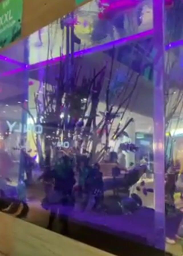 large, clear rectangular aquarium filled with water, decorative branches, plants, and fish. The aquarium is lit with purple light. Reflections on the aquarium glass show people browsing in a store across the walkway. The base of the aquarium appears to be made of wood. Part of a sign with the word "XXL" is visible to the side of the aquarium.