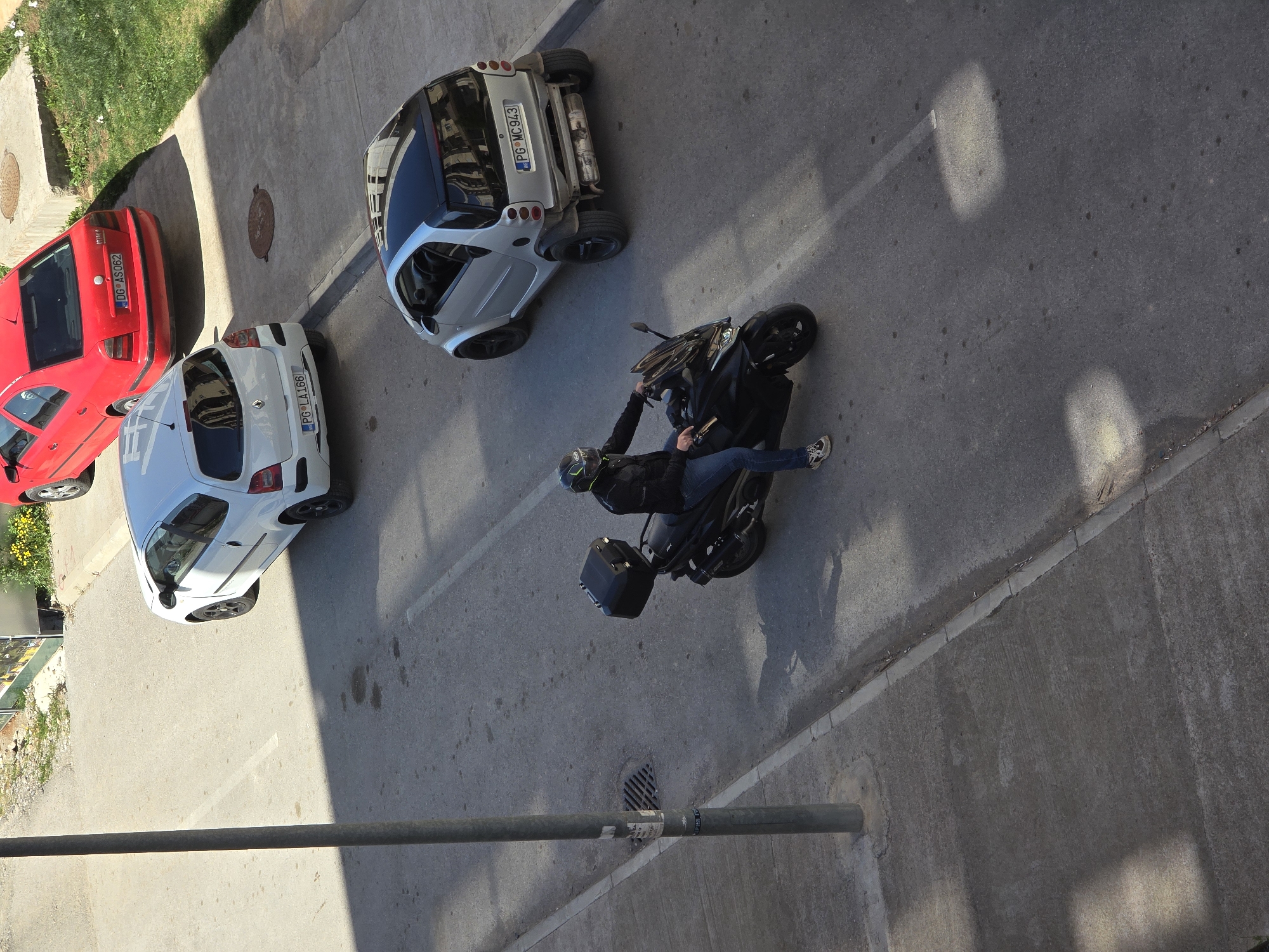Captured from an elevated perspective, the image depicts a street scene in Podgorica, Montenegro. Three cars are parked on the left side: a red hatchback, a white compact car (PG LA166) and a Smart car (PG MC 943). A motorcyclist is riding a black motorcycle in the middle of the road. The motorcyclist is wearing a helmet and light blue jeans. A black case is attached to the back of the motorcycle. The street is surrounded by a green area on one side and an adjacent building on the other. In the lower right, a lamppost casts a shadow on the street.