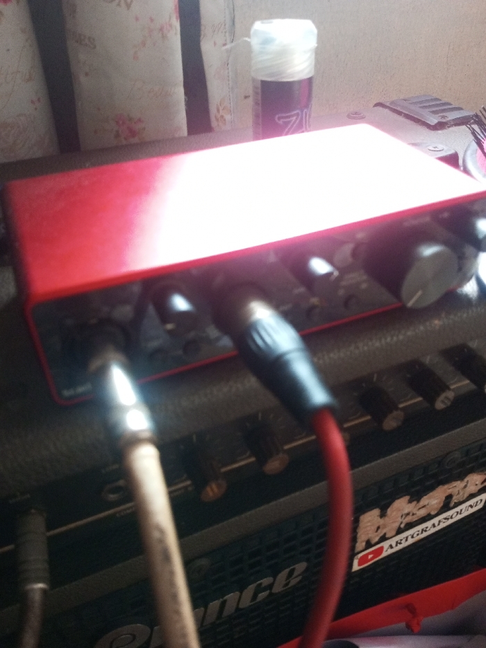 A red audio interface sits atop a dark amplifier. Two cables are plugged into the interface's front panel. One cable is beige, and the other is red with a black connector. The amplifier features several knobs and branding with a YouTube logo and the text "ARTGRAFSOUND." A bottle is in the upper-right corner, near a pillow with floral pattern.
