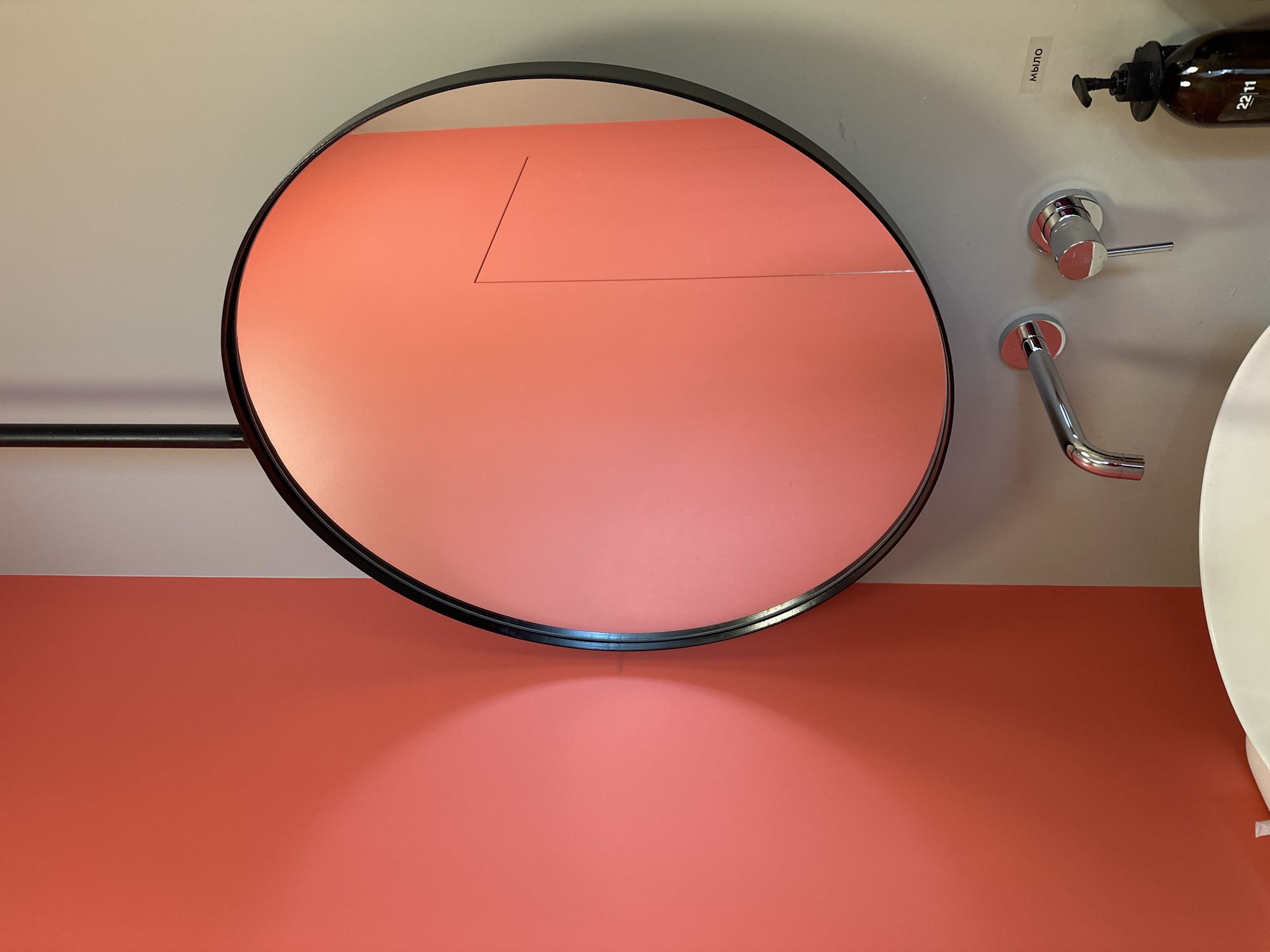 A high-angle, close-up shot shows a bathroom scene, likely inside a commercial establishment in Kazan, Russia, as indicated by the Cyrillic lettering on a "Мыло" (soap) label adhered to the wall. The focal point is a large, round mirror with a black frame, reflecting the salmon-colored surface beneath, which appears to be a countertop or vanity. Two straight lines are partially visible in the mirror's reflection, running horizontally and diagonally. To the right of the mirror, mounted on a light gray wall, are bathroom fixtures: a black soap dispenser, a chrome faucet handle, and a chrome faucet. A portion of a white sink is visible on the right edge of the frame. A horizontal, dark metal bar is partially visible on the left side of the mirror. The salmon-colored surface continues below the mirror, casting a shadow that suggests a light source from above. The overall setting suggests a modern or contemporary style bathroom.