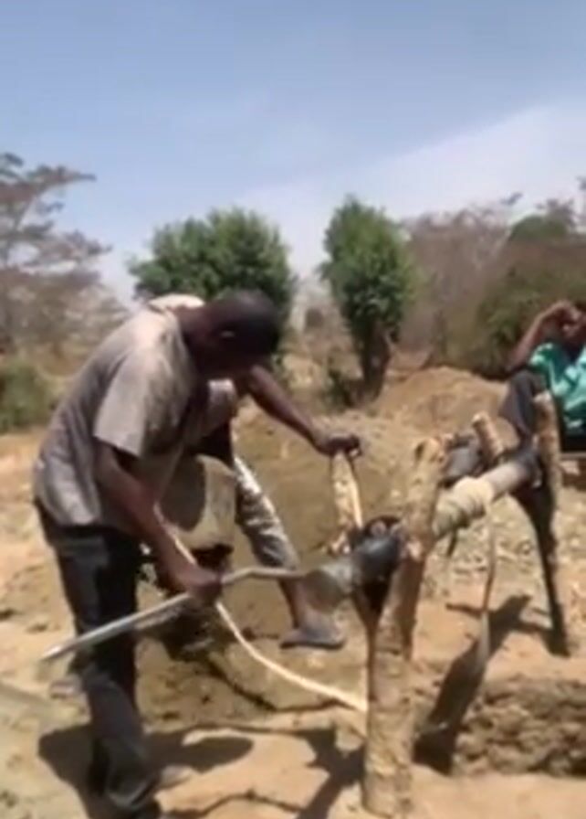 A group of people are working outdoors, possibly in a rural or semi-arid environment