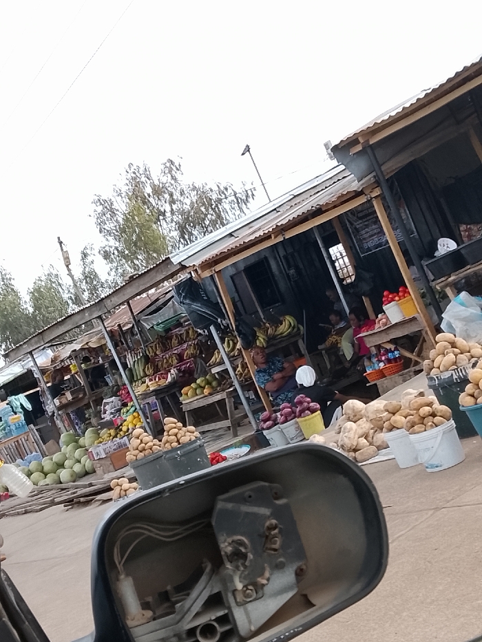 An outdoor market scene in Unknown, Unknown, is captured under an overcast sky, viewed from a slightly elevated perspective. Multiple open-fronted stalls, constructed with wooden frames and corrugated metal roofs, line a dirt or lightly paved thoroughfare. The stalls display various produce: large quantities of green fruits (possibly gourds or watermelons) are piled on the ground to the left, while numerous bunches of bananas hang from shelves within the stalls. Piles of mangoes and other round fruits are also visible. Several individuals populate the market. A woman in a blue patterned top is seated behind a stall counter, with her left arm resting on a white object. Near her, another person with a white head covering is partially visible. Further within the rightmost stall, additional figures, including adults and possibly a child, are dimly discernible. Large quantities of potatoes are arranged in buckets and on the ground in the foreground and midground, alongside buckets of red produce, likely onions. The lower foreground is significantly obscured by the interior components of a broken, dark-colored vehicle side mirror, revealing exposed wiring and mounting mechanisms. In the background, trees with sparse foliage and utility poles extend towards the horizon.