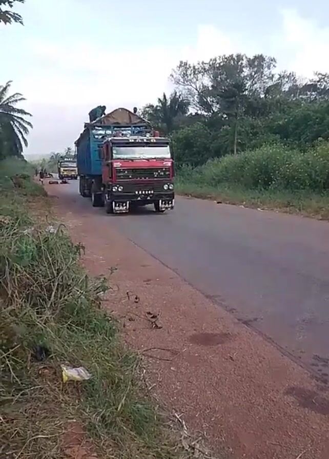A large, red and blue truck is driving along a paved road with a brown shoulder. The truck has a high-sided, blue cargo bed that appears to be mostly empty, save for some objects covered by a tarp. A person is visible on top of the covered cargo. The truck is driving towards the camera and passes by. The surrounding environment includes green vegetation on both sides of the road, including palm trees. Another similar truck is visible in the distance. There is some litter on the side of the road. The sky is overcast.