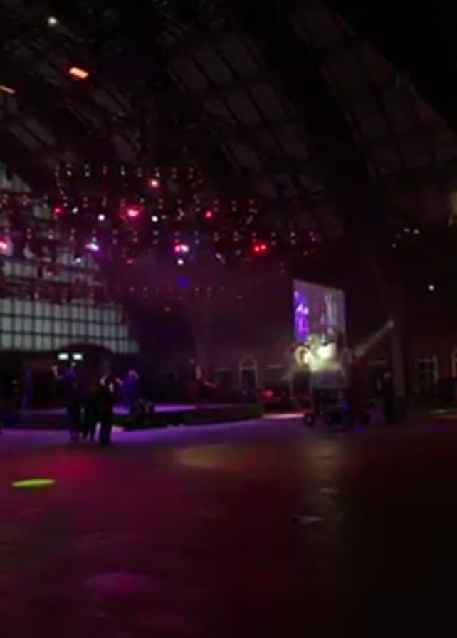 n indoor space, likely a large hall, set up for a performance or event. There is a stage with a large screen displaying visuals, and numerous lighting fixtures hang from the ceiling, emitting red, green, and blue lights. Several people are on the floor, some near the stage and others further back. There appears to be camera equipment near the screen. The lighting creates a colorful, atmospheric effect.