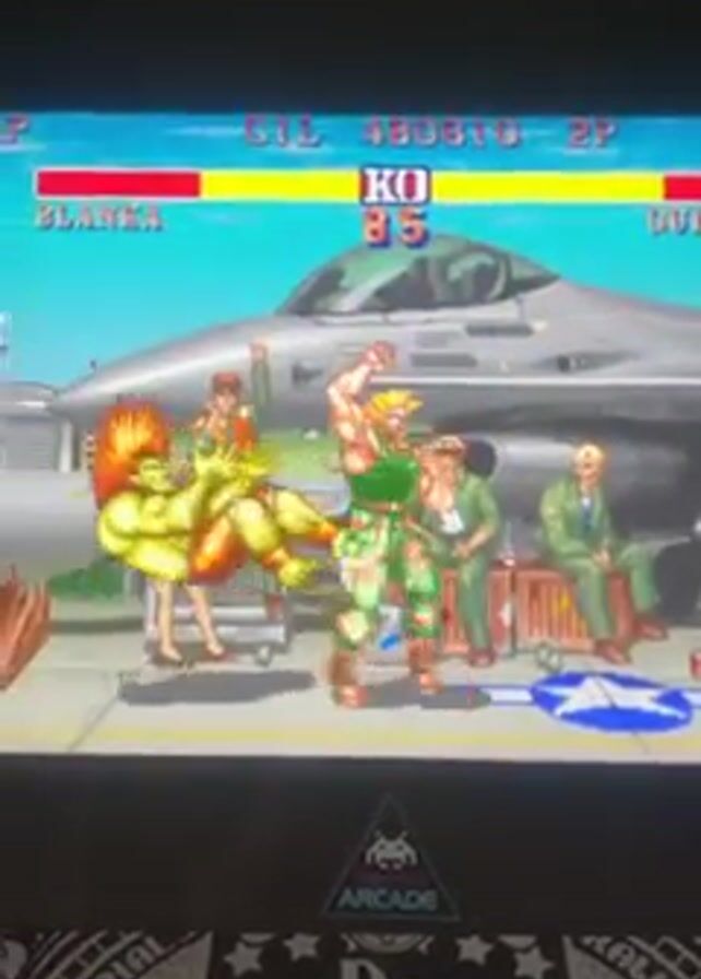 gameplay from the classic arcade game Street Fighter 2. The characters Blanka and Guile are battling on Guile's stage, which is set on an aircraft carrier with an F-16 fighter jet in the background. Blanka is controlled by the player and is currently losing the fight. Blanka is knocked down several times. The game is being played on an Arcade1up cabinet with a Jack Daniel's sticker on the bottom.