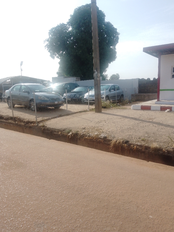 The image depicts an outdoor scene in Sabon Tasha, Nigeria, under bright, hazy daylight. In the foreground, a textured, light brown asphalt road surface occupies the lower third of the frame. Above the road, a raised dirt curb with sparse dry vegetation and debris separates it from an unpaved, dusty shoulder. A metal wire fence with vertical posts runs along this shoulder, delineating a vehicle parking area. Within the parking area, at least six cars are visible. Prominently positioned on the left is a dark grey sedan, possibly a Toyota Corolla, featuring aftermarket multi-spoke rims, facing towards the right. Behind it, a darker vehicle is partially obscured. Further right, a dark sedan and a silver hatchback (possibly a Peugeot model) are parked. Other lighter-colored sedans are partially visible further back and to the right. The ground within the parking area appears unpaved and dusty. In the mid-ground, a tall, dark utility pole stands centrally, bearing faded markings or posters. To the left, a large, dense green tree with a rounded canopy dominates the upper background against a bright sky, casting a shadow. A light-colored wall forms a boundary behind the parked cars on the left. To the right of the utility pole, a small, partially visible building features a red-brown roof overhang and white walls with a green horizontal stripe near its base. The base of the building's exterior curb is painted with alternating red and white stripes. No individuals are present, and no actions or interactions are occurring. The environment appears dry and semi-urban or commercial.