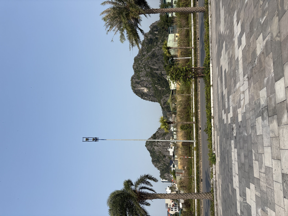 This image captures an outdoor urban landscape in Ha Tu Ward, Vietnam, under a clear, bright blue sky. The foreground consists of a tiled paved area exhibiting an irregular pattern of light grey and darker grey square and rectangular pavers. Beyond this pavement, an asphalt road stretches horizontally, bordered by a concrete curb and a median strip. The median contains sparse, dry, light brown vegetation, a few small green bushes, and a single white-and-red striped marker post. A tall, slender grey metallic streetlight pole rises from the median, featuring two square-shaped light fixtures positioned at its apex. Three prominent palm trees are visible: one on the far left with a robust trunk and green fronds, another slightly to the right of the paved area, and a third, smaller palm tree situated in the median to the right of the streetlight. In the background, large, rugged karst limestone mountains with dark grey rock faces and patches of green foliage dominate the horizon. Interspersed at the base and between these mountains are various light-colored buildings, some with visible rooftops. No people, vehicles, or dynamic actions are depicted.
