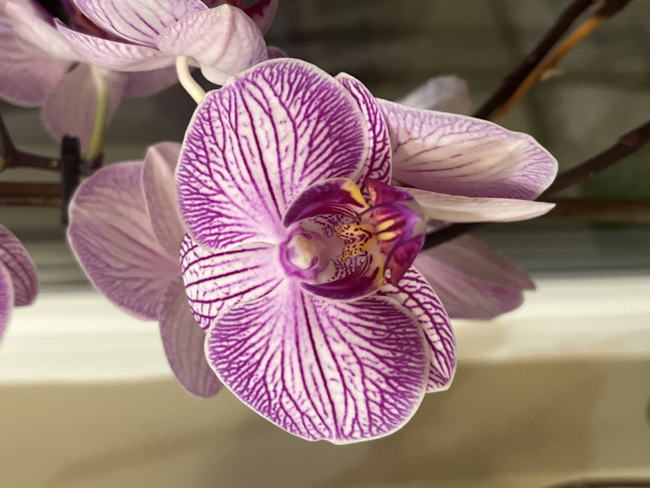 A close-up, vertical-format photograph presents a single, fully bloomed Phalaenopsis orchid flower. The flower's petals are predominantly white, patterned with prominent, deep purple-magenta stripes that radiate from the center. The labellum (lip) is an intense purple-magenta, featuring intricate yellow and orange speckles and markings within its throat. Other orchid flowers or buds are out of focus in the blurred background. The background elements consist of a soft, creamy beige tone to the left, possibly a wall or surface, and darker, undefined areas to the right. A faint vertical light strip, potentially a window or door frame, is vaguely visible in the mid-left background. No people, distinct objects beyond the orchid, or explicit actions are visible. The specific location in Varna, Bulgaria, cannot be determined from the visual information presented in this image.