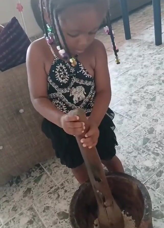 A young girl with braided hair is standing and using a large, wooden pestle to grind something in a wooden mortar