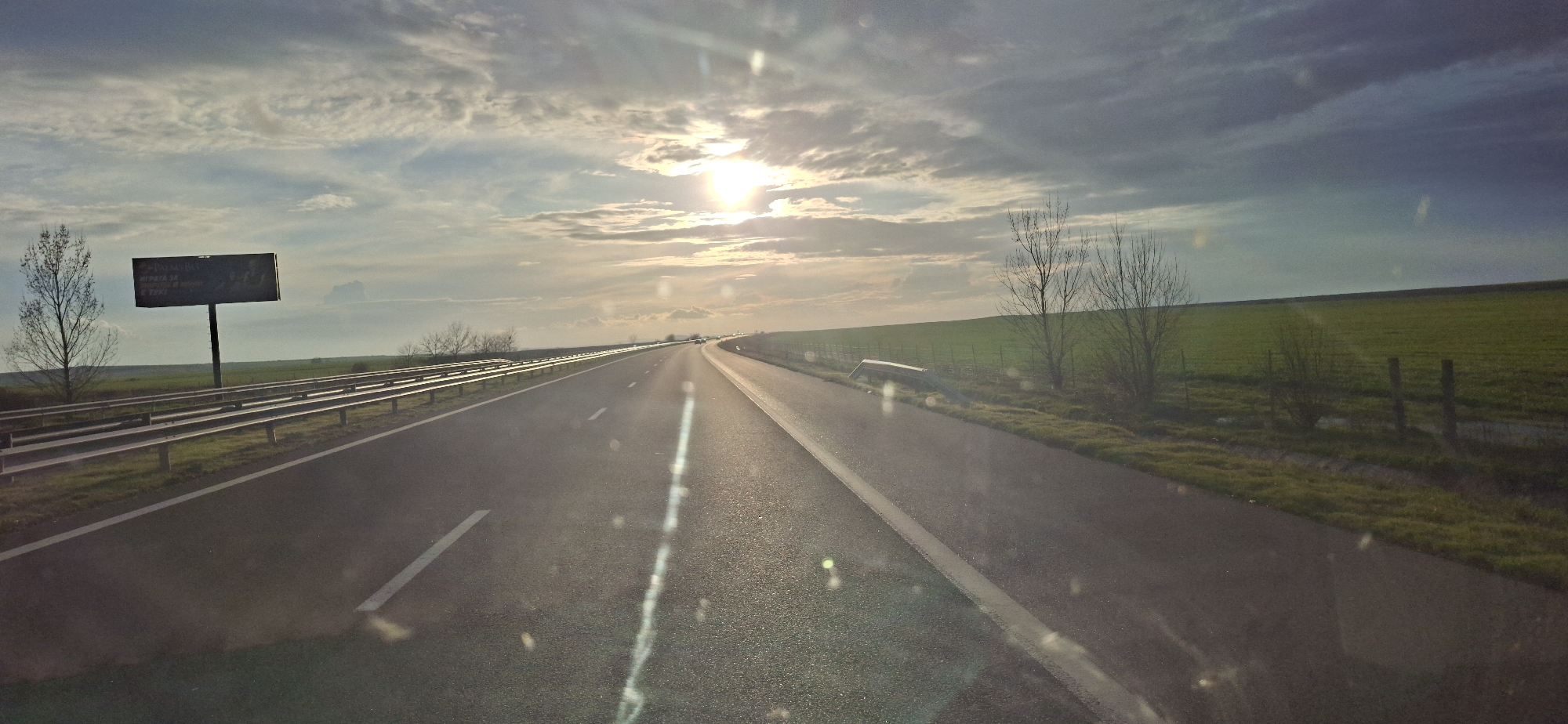 A daytime shot features a two-lane asphalt highway receding into the distance under a partially cloudy sky with the sun visible. The sun appears to be setting or rising on the horizon, casting a bright glare on the road surface. Roadside safety barriers line the left side of the road, and beyond them, there is a billboard with text in Cyrillic. Trees and open green fields flank both sides of the highway. The general condition suggests the image was taken while driving on the highway between Vodenichane, Bulgaria, and a location further along the route.