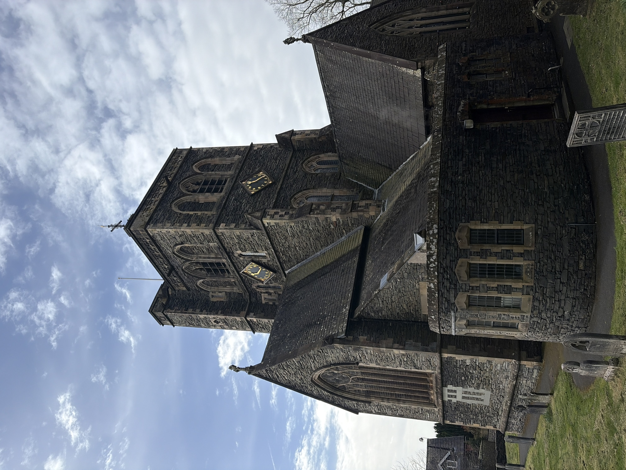 The image displays St. Martin's Church, located in Bowness-on-Windermere, within the broader area of Windermere, United Kingdom. The church is constructed from dark grey, irregularly cut stone blocks and features a prominent central square tower with battlements. Two clock faces are visible on the tower, both with gold numbers and hands on a dark background; one indicates approximately 9:15, and the other approximately 2:10. The structure includes multiple tall, arched windows with stone tracery and steeply pitched slate roofs, topped with cross finials. A flagpole extends from the tower. A rounded annex with multiple rectangular windows is attached to the main building. The immediate foreground features a grassy churchyard containing several weathered stone grave markers and a curving paved pathway. The sky is partially cloudy with blue patches and scattered white clouds. No individuals are present in the scene.