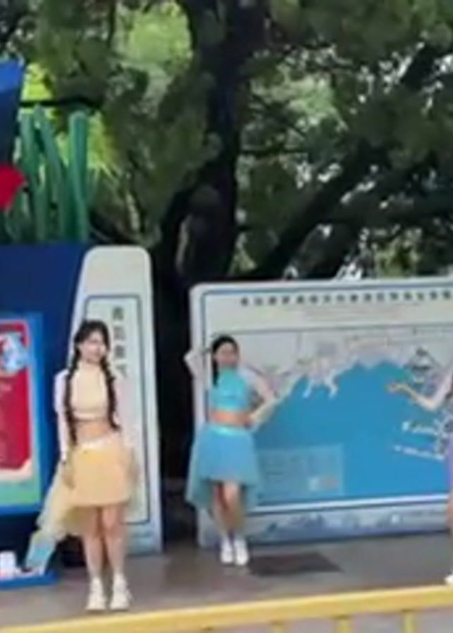 Three young women are dancing in front of the entrance to a theme park. The woman on the left wears a beige tutu, the woman in the center wears a blue tutu, and the woman on the right wears a lavender tutu. They have matching sequined tops. They are performing a choreographed dance to a fast-paced song. Behind them is a large sign with information about the park, a Chinese flag, and a yellow metal railing. The park entrance is to their left, and there are trees and greenery surrounding the area.