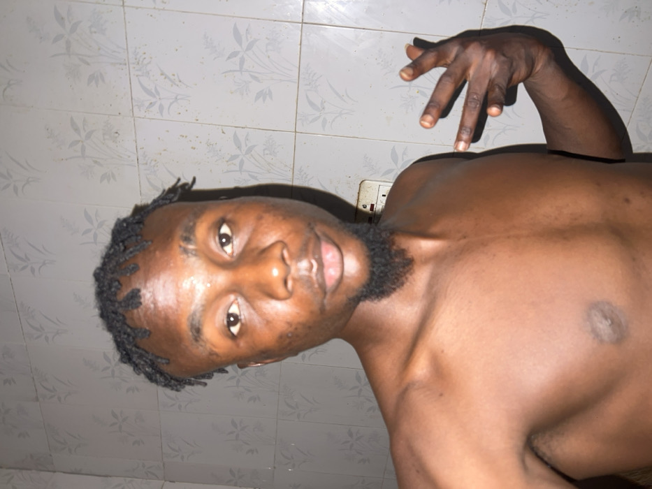 A shirtless man with short dreadlocks and a neatly trimmed beard poses. His skin is smooth and glistens with moisture. He's indoors, with patterned tiles visible in the background, where an electrical outlet is. He's facing the camera with a relaxed expression. His hand is raised, fingers slightly spread apart. The photo appears to be taken from a lower angle, making him look down at the viewer.
