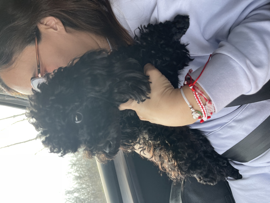 An indoor scene within a vehicle in Zlatinitsa, Bulgaria, features a female individual and a small black dog. The female, positioned on the right, has dark hair and wears glasses with brown frames. She is dressed in a light-colored long-sleeved garment, possibly a hoodie, and a black seatbelt crosses her torso diagonally. Her right wrist displays multiple bracelets, including red and white string bands and one with a silver-colored charm featuring red and green accents. Her right hand is placed on the black dog, which occupies the central and left portions of the frame. The dog, characterized by dense black curly fur and large dark eyes, is looking towards the left side. Through the vehicle's window on the left, an out-of-focus exterior background is visible, showing bare tree branches or sparse vegetation against a bright sky.