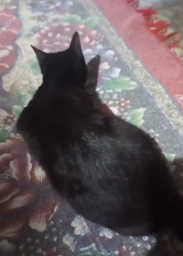 A stationary top-down shot shows a black cat resting on a patterned rug