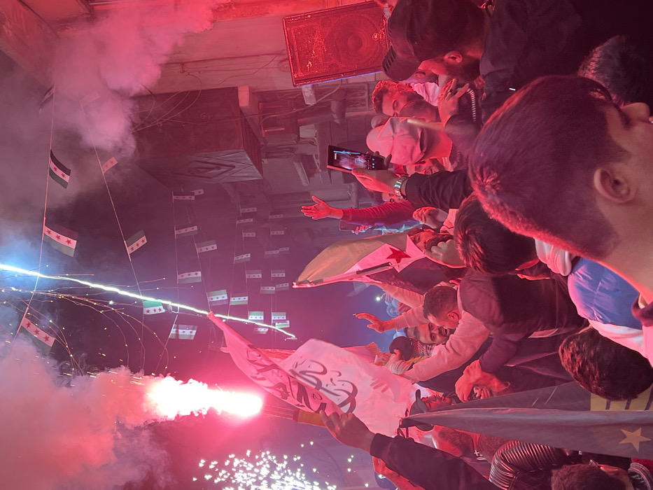 - "A crowd of people celebrates, waving Syrian flags and banners in a red-lit environment filled with smoke and fireworks" by FM-JY1rf2, licensed under CC BY 4.0
