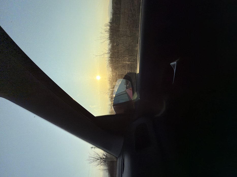 The scene is viewed from inside a vehicle, looking out the front passenger window towards a rural landscape in Blagovo, Bulgaria. The time of day is characterized by a low-lying sun, indicating either late afternoon or early morning. In the immediate foreground, the dark interior of the vehicle is visible, encompassing the A-pillar on the left, a segment of the dashboard, and the passenger door panel which features a reflective door handle. The exterior side mirror is prominent, reflecting a blurred red vehicle. The window glass exhibits visible dust or smudges. Beyond the vehicle, the exterior environment under a clear, light blue sky is illuminated by a bright yellow sun positioned near the horizon. The landscape consists of dry, brownish ground, sparsely populated with bare deciduous trees, and distant hills or mountains along the horizon line. A utility pole is visible in the middle distance on the left side of the frame. No individuals are present, and no specific actions or interactions are occurring.