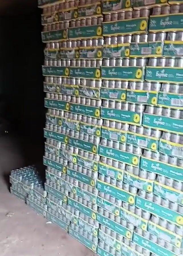 storage area, possibly a warehouse or a large storeroom, filled with stacks of canned pineapple juice