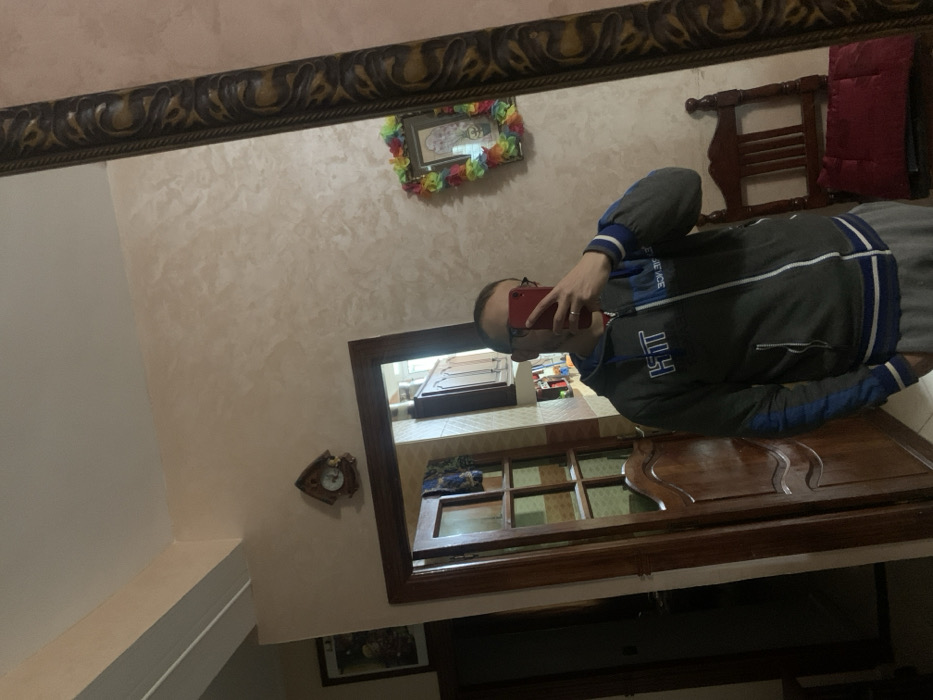 A man with glasses holds a red phone, reflected in an ornate mirror. The reflection shows a grey and blue jacket. Behind the man is a chair with a red cushion. Decorations include a flower wreath around a small picture, a small clock, and another framed picture. The mirror frame is dark wood with decorative molding. The background wall is textured in light tones.