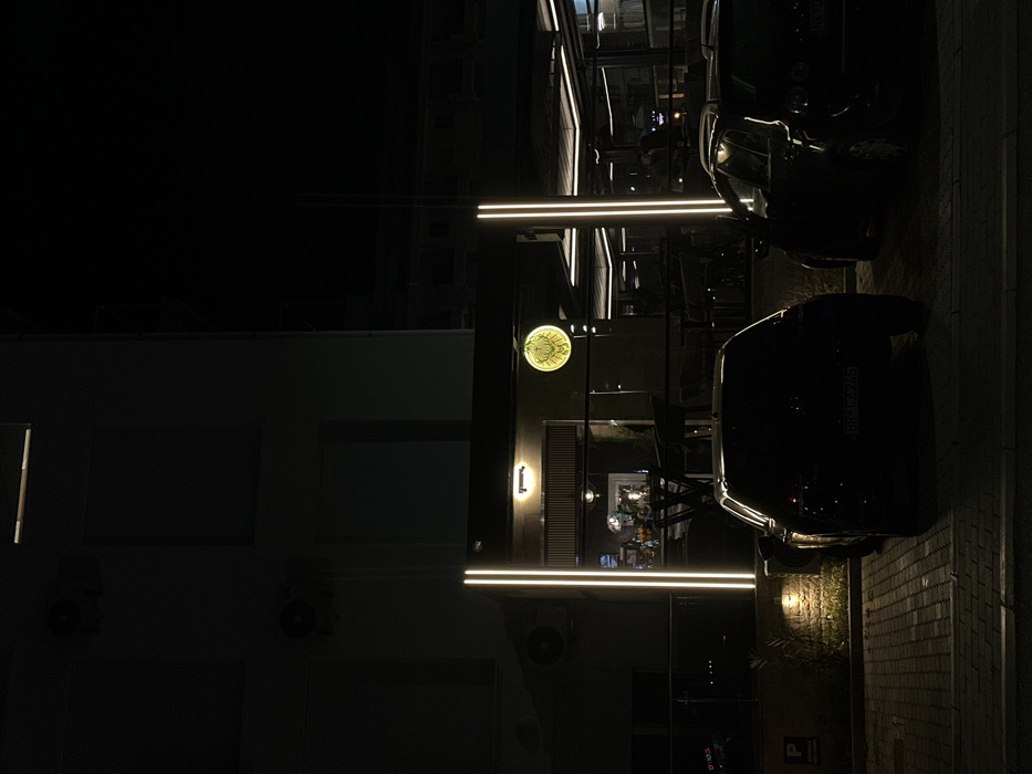 The image depicts a nighttime scene in Šušanj, Montenegro, featuring a commercial establishment with an illuminated facade and an adjacent outdoor seating area. The primary structure is a multi-story building with a dark, unlit upper section exhibiting two dark, rectangular windows and two external air conditioning units. The ground level features the brightly lit establishment. A circular, yellow-green illuminated sign, possibly depicting a stylized emblem with text below, is centered above an entrance area. The facade is accentuated by two vertical, linear LED light strips on either side of a recessed entrance or window. An overhead awning extends over an outdoor seating area, which is partially visible on the right, featuring multiple tables and chairs under a canopy illuminated by recessed ceiling lights. Indistinct human figures are present within this outdoor dining area. In the foreground, two dark-colored vehicles are parked on a paved surface composed of interlocking bricks. The car on the left is a dark hatchback (possibly a Volkswagen Golf) parked with its rear towards the viewer, displaying a partially visible Montenegrin license plate "BP EN 225". To its right, another dark vehicle, possibly a sedan or SUV, is parked. A white "P" (parking) sign on a dark pole is visible on the far left. Small shrubbery is present near the building's base, illuminated by an upward-facing ground light. The overall environment is dark, with artificial lighting concentrated on the establishment and immediate surroundings.