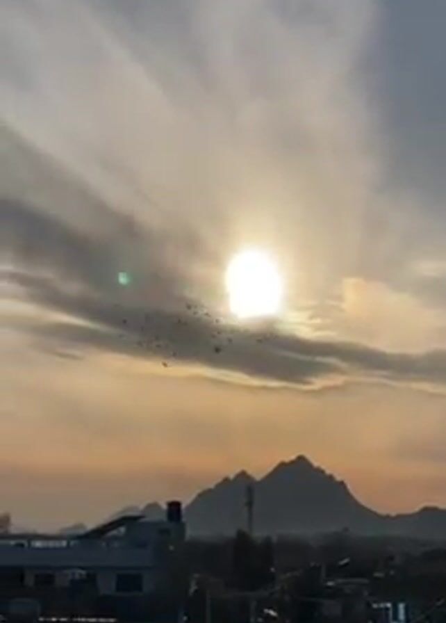 sunset scene with birds flying in formation in the sky. The sun is bright and partially obscured by clouds. In the background, there are mountains and buildings. The sky has a gradient of colors, from orange near the horizon to gray and white higher up. The clouds have a wispy, streaky texture. The foreground includes rooftops and trees.