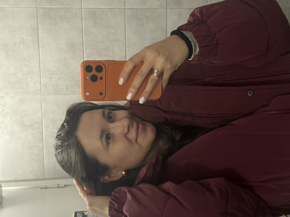 A female individual is depicted in a mirror selfie taken within a tiled indoor space, consistent with a restroom or changing room, in the city of Unknown, Russia. The woman, appearing to be in her 20s or 30s, has dark brown hair with some visible gray strands near the part. She wears a maroon puffer jacket over a light-colored garment, visible at the cuff of her right wrist, and small gold-colored hoop earrings. Her right hand, featuring white manicured nails (some with subtle glitter), holds an orange-cased smartphone towards the mirror to capture the image. This hand wears multiple rings on the ring finger, including a prominent silver-colored ring with a central stone and several thinner gold-colored bands above and below it. A black scrunchie is present on her right wrist. Her left hand is raised, with fingers touching or adjusting her hair on the upper left side of her head. She displays a slight smile and looks towards the phone's reflection. The background consists of light-colored, square wall tiles. On the far left of the reflection, a partial view of a white structural element and an indistinct dark object with unreadable text are visible.