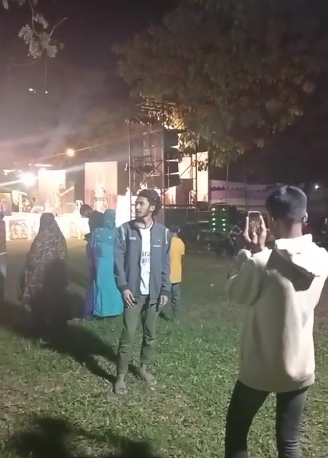 At night, a group of people gathers on a grassy lawn. In the background is a stage with lights, equipment, and a group of musicians. A young man in a jacket, t-shirt, and pants stands in the center of the frame as another person takes a photo of him with their cell phone. Other individuals, some in colorful clothing, are scattered throughout the area. The scene is illuminated by stage lights and the soft glow of the night sky. Trees surround the edges of the lawn, adding to the outdoor setting.