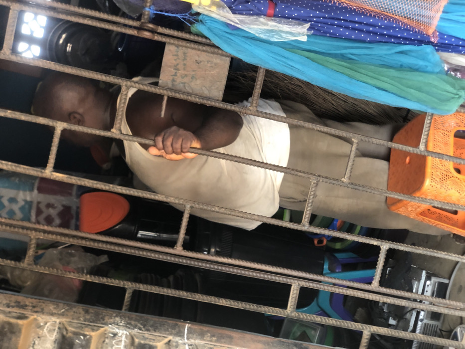 The scene is an interior or storefront in Egan, Nigeria, observed through a dark metal security grate constructed from rebar. **People**: One adult male, dark-skinned, with a balding head, is present behind the grate. He wears a white sleeveless undershirt and light-colored trousers. His face is turned away from the camera, angled to the left, and partially obscured by the grate. His right hand grips a vertical bar of the grate. **Objects**: * **Foreground**: A dark brown metal security grate with a grid pattern dominates the view. An orange plastic stool, perforated with small holes, is visible in the lower right, behind the grate. * **Midground**: A light-colored rectangular sign or board with dark, indistinct writing is visible to the right of the man's head, behind the grate. To the far right, several textile items hang vertically, including a blue fabric with white polka dots, a sheer orange fabric, and crumpled pieces of blue and green fabric. * **Background**: Various items are present. In the upper left, an orange, ridged, semi-circular object is affixed to a dark cylindrical item. Below this, stacks of plastic chairs in colors such as teal, blue, and orange are visible. A silver electronic device rests on the floor in the lower left. An overhead light fixture with square cells emits light from the upper right corner. A dark, elongated object, possibly a broom or brush, is partially visible vertically behind the hanging textiles. Other dark, indistinguishable objects are scattered throughout the background. **Actions**: The male individual is standing and gripping a vertical bar of the security grate. **Interactions**: No direct interactions with other individuals are observed. **Environment**: The setting suggests a retail or storage area, characterized by varied merchandise and a somewhat cluttered interior, illuminated by an overhead light and possible ambient light.