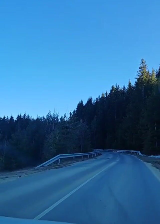 A car drives along a winding paved road flanked by dense evergreen forests on either side. The sky is a clear, bright blue. A gray metal guardrail runs along the edge of the road. Patches of snow are visible in the shoulder of the road in shaded areas. The road has a single white lane divider. The view is from inside the car, looking forward.