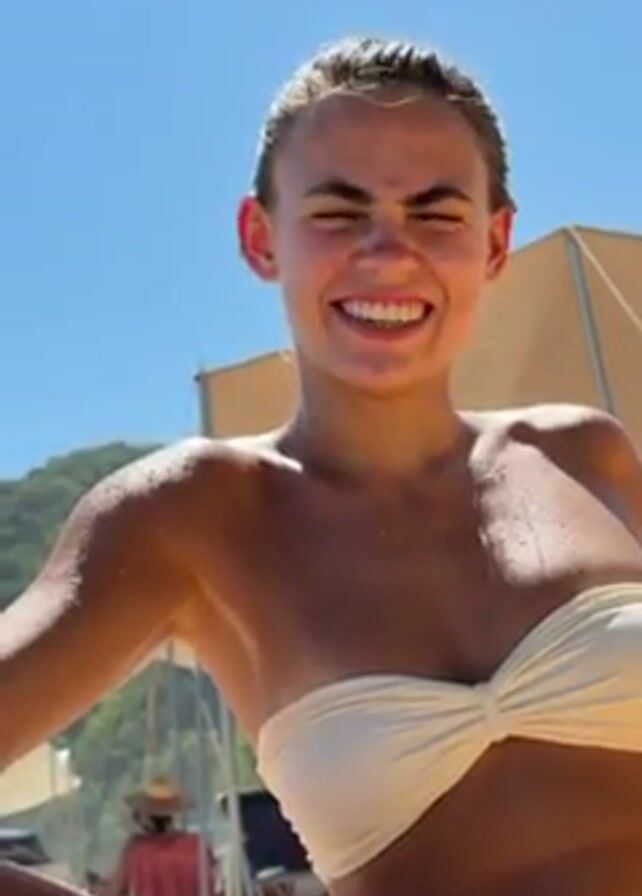 A woman wearing a white bandeau-style top is sitting on a sandy beach on a sunny day