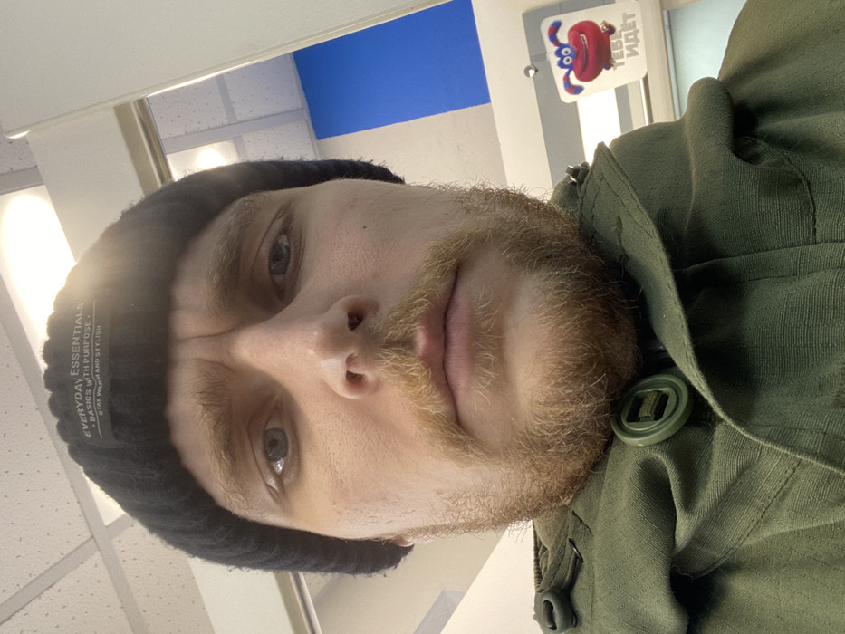 A close-up, upward-angled selfie photograph depicts an adult male in an indoor commercial or public space in Perm, Russia. The subject has fair skin, blue eyes, a furrowed brow, and reddish-brown facial hair, including a mustache and full beard. He wears a black knit beanie with a white label reading "EVERYDAY ESSENTIALS BASICS WITH PURPOSE # STAY WARM AND STYLISH" and an olive green jacket, visible by its collar and a large circular olive green button/fastener. The overhead environment features a ceiling with white acoustic tiles and embedded rectangular fluorescent light fixtures. To the upper right, a distinct section of a bright blue wall or panel is visible. In the lower right background, a white rectangular sign with a rounded top edge displays a cartoonish red, furry creature with large eyes and a smile, accompanied by Cyrillic text that reads "ТЕБЕ ИДЁТ" (It Suits You or It Looks Good On You), indicating a commercial establishment. No other individuals or specific actions are discernible.