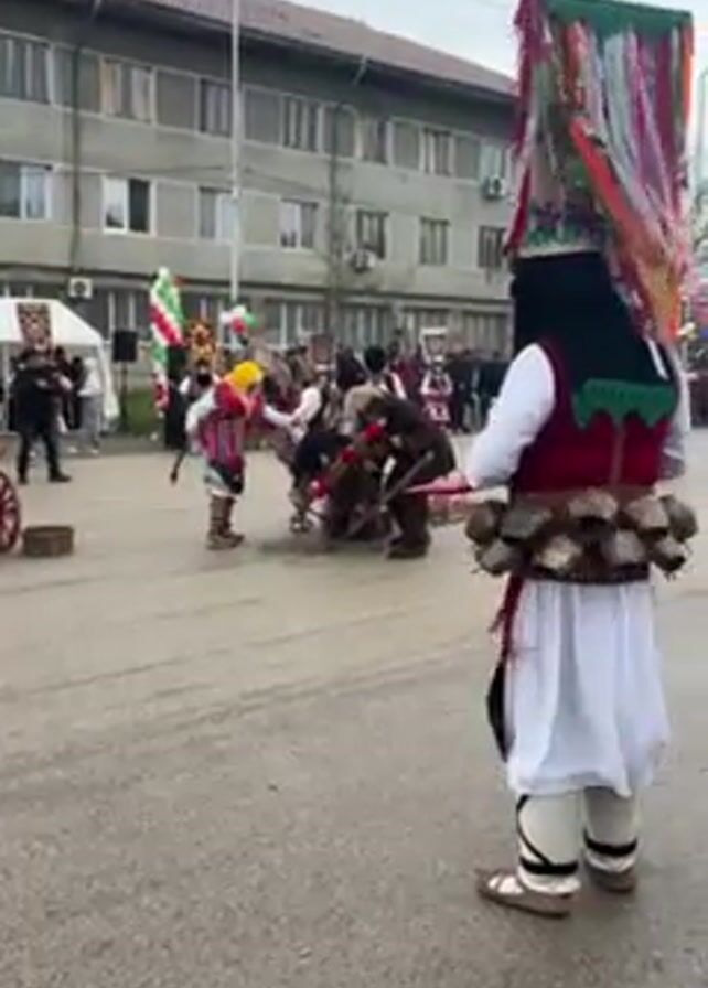 group of people dressed in traditional Bulgarian Kouker costumes performing in a public square. The background includes a light gray, multi-story building, tents, and other people observing the performance. The camera focuses on one Kouker in particular, whose costume consists of a tall, colorful headdress, a red vest over a white tunic, and several large bells attached to the waist. In the center, several Koukers are wrestling on the ground, enacting a traditional performance. The overall setting is festive, with a cultural event taking place in an urban environment.