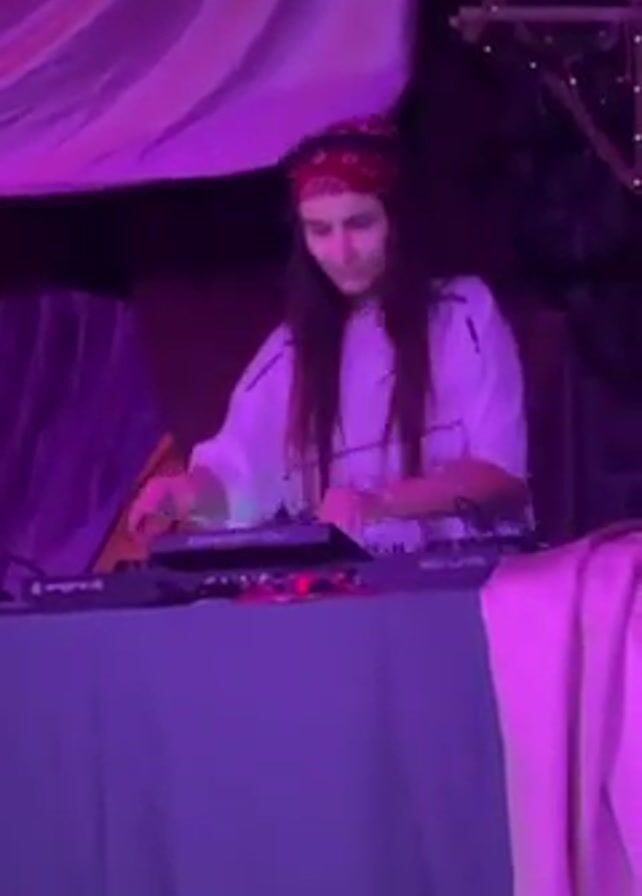 A female DJ is shown mixing music at a DJ setup, wearing a white, slightly oversized shirt and a red bandanna. She has long, dark hair. The DJ station consists of a Pioneer DJ controller and mixer, sitting on a table draped with a green cloth, under purple lighting. A pink fabric covers something to her right, and above her, hanging fabric is lit with pink and purple lights. The backdrop has dark, indistinct shapes, and a decorative twig or light structure is seen to the right of the frame. She seems focused on her equipment, adjusting dials and levels. The sound of electronic dance music is present in the audio.