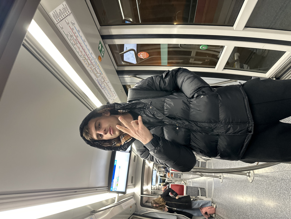 An image taken inside a public tram or light rail vehicle depicts three individuals and various interior features. The location is specified as Hoenheim, France. In the foreground, a young adult male stands facing the camera. He has short brown hair and is wearing a black hooded puffer jacket with a brown plaid lining visible inside the hood. His right hand is raised, displaying an open palm with the thumb, index, and middle fingers extended upward. His left hand is in the pocket of his jacket, and he is wearing black pants. A black backpack is visible on his shoulders. Overhead, white linear fluorescent lights illuminate the cabin. An electronic display screen shows "16:03" and a partial route map. Above the windows and doors on the right side of the frame, a detailed multi-colored public transport route map is affixed. The floor is light grey with a speckled pattern. In the mid-ground to the left, a young adult female with long brown hair stands, looking down at a mobile phone held in her hands. She is dressed in a dark jacket, light blue jeans, and light-colored sneakers. A light pink backpack rests on the floor near her feet. Further into the background, other indistinct figures are partially visible seated on red-upholstered seats. Vertical silver poles for standing passengers are present throughout the cabin.