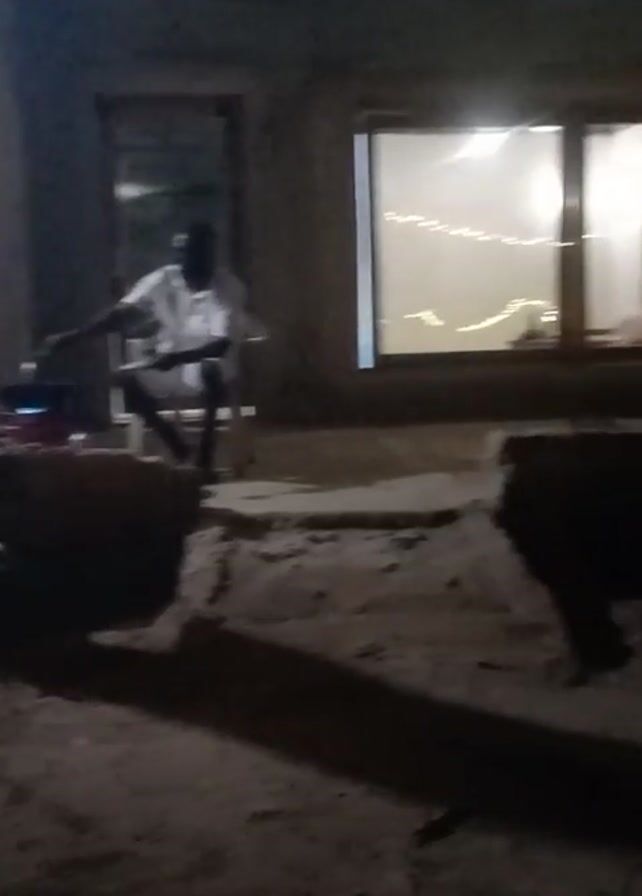 The video is recorded at night, in an outdoor space illuminated by string lights