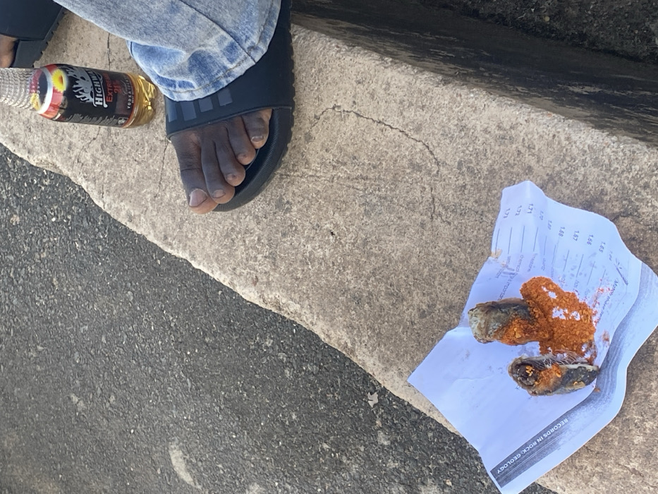 The scene in Bar Gada, Nigeria, shows a lower right leg and foot of an individual, clad in light-wash blue jeans and a black slide sandal, resting on a rough, light grey concrete curb. Beside the foot, a clear glass bottle labeled "Highway Extreme 21+" Vodka Mix stands upright on the curb. To the lower left, a crumpled piece of white paper, bearing partial text "RECORDS IN ROCK GEOLOGY," holds two pieces of fried or roasted fish, split lengthwise, and a mound of reddish-orange spice, likely a chili mixture. The background consists of a dark asphalt surface.