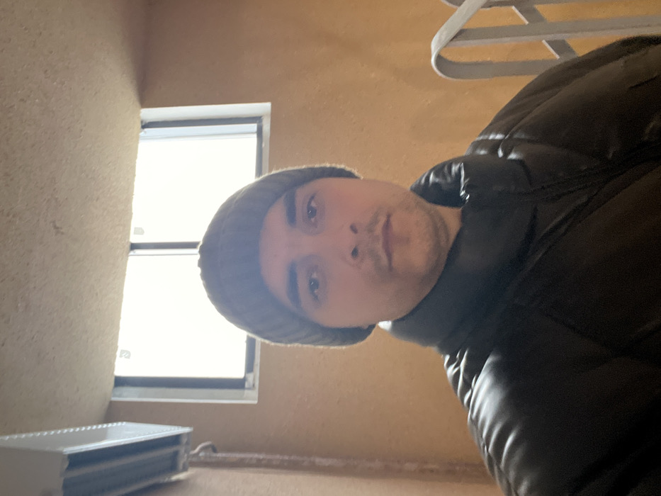 An adult male is captured in a head-and-shoulders selfie indoors, within a building in Nekrasovskiy, Russia. The subject, facing forward with a neutral expression, wears a dark olive knit beanie and a black puffer jacket with a prominent collar. His dark hair is visible beneath the beanie, and he has dark eyes with faint stubble. The background consists of light brown, textured walls and a lighter, off-white textured ceiling. A rectangular window on the upper left provides strong natural light, obscuring the outdoor view. Below and to the left of the window, a white, horizontally slatted air vent or grille is affixed to the wall. On the lower right, a portion of a silver-colored metal handrail, likely part of a staircase, is visible. The scene is illuminated primarily by the natural light from the window. The precise street location or building type within Nekrasovskiy is not visually discernible.
