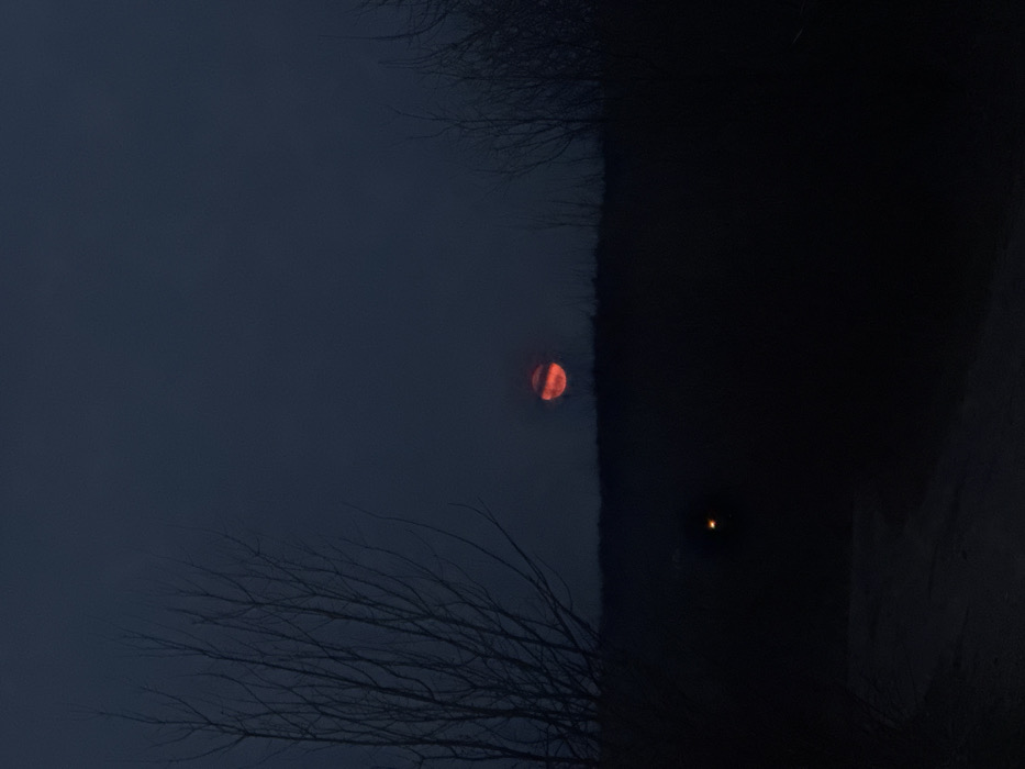 The image depicts a dark, low-light outdoor scene in Bistritsa, Bulgaria, likely at dusk or night. A prominent, large, reddish-orange celestial body, possibly the moon or sun, is centrally positioned above the dark horizon, exhibiting horizontal striations. The sky above is a uniform dark blue-grey, appearing overcast. In the foreground, silhouetted bare branches of deciduous trees are visible on the left and right edges of the frame. The ground in the lower portion of the image is largely obscured by darkness, though a faint, lighter-colored path or road is discernible extending from the bottom center. A small, distinct yellowish-orange light source is visible in the dark midground, slightly to the left of the center. No individuals or specific human activity are visible.