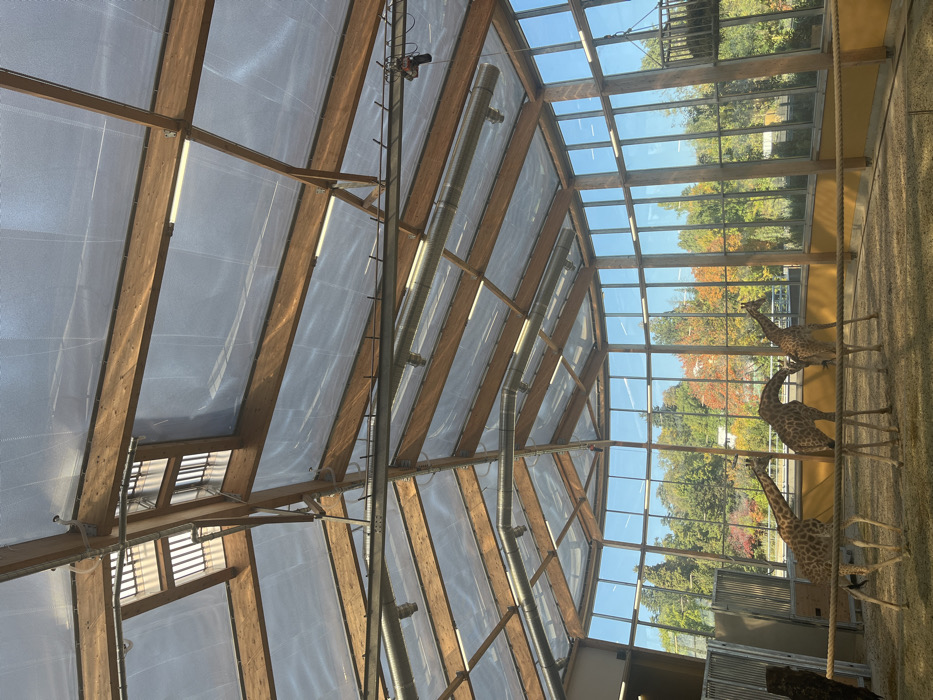 This image depicts the interior of a giraffe enclosure at the Parc Zoologique & Botanique de Mulhouse (Mulhouse Zoological and Botanical Park) in Mulhouse, France