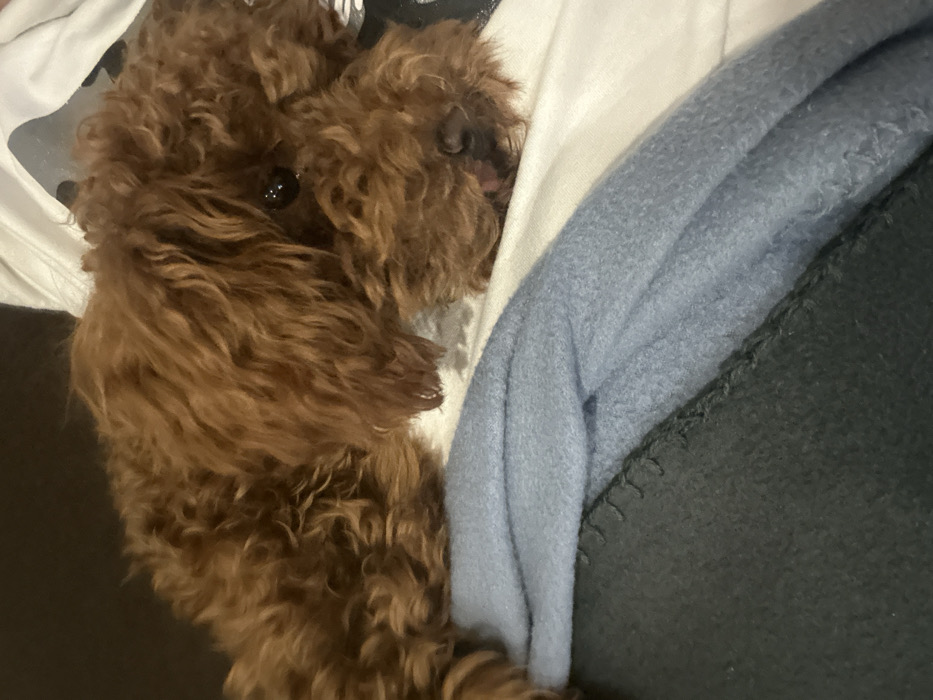 A small, curly-haired dog, appearing to be a Poodle or Poodle mix, with reddish-brown to auburn fur, is depicted resting