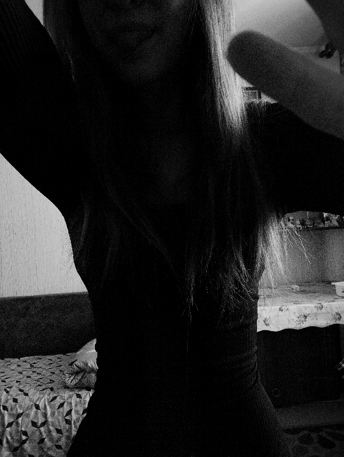 The image is a black and white, low-light photograph depicting an indoor scene in the city of Engels, Russia. A female subject is positioned centrally, her upper body and head largely rendered in deep shadow and silhouette. She has long, light-colored hair that falls over her shoulders and chest, and wears a dark, form-fitting, long-sleeved garment, possibly ribbed. Her face is obscured, with only a faint outline of the mouth visible. Both arms are raised, and a blurred finger or thumb from her right hand is prominently visible in the upper right quadrant, close to the camera lens. The background to the left features a bed covered by a patterned bedspread with a geometric design, a visible pillow, and a dark headboard positioned against a light-colored, textured wall. The background to the right includes a table or similar furniture item draped with a light-colored, patterned tablecloth, with a dark, rectangular object visible beneath it. The environment is dimly lit, resulting in high contrast and heavy shadows.