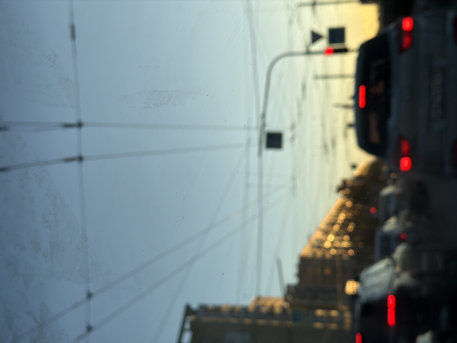 The image presents a highly blurred urban street scene, captured through a dirty or smudged windshield, with numerous streaks and dust specks visible across the frame. The perspective is from within a vehicle, looking forward. **Time of Day and Lighting:** The scene is illuminated by a low-angle sun, suggesting either sunrise or sunset. The sky transitions from a light blue at the top to a warm yellow-orange hue near the horizon. This "golden hour" light intensely illuminates the facades of distant buildings on the left, creating strong bokeh effects. **Environment and Infrastructure:** The setting is a multi-lane city street in Saint Petersburg, Russia. The sky is crisscrossed by a dense network of black overhead wires, indicative of an extensive electric public transport system (trams or trolleybuses). Several poles and support structures for these wires are present. Suspended above the roadway are multiple traffic signals and road signs; a prominent red traffic light is visible on the right, along with several square blue signs with indistinct white symbols and at least one triangular yield sign. **Vehicles:** The midground and foreground are occupied by multiple passenger vehicles, primarily cars, appearing to be stopped or moving slowly in traffic. The rear taillights of several vehicles are illuminated red, suggesting they are braking or stationary. A light-colored SUV-like vehicle is most prominent in the mid-right, facing away from the camera, with its brake lights activated. Due to the blur, vehicle make, model, and license plate details are indiscernible. **Buildings:** A continuous line of multi-story buildings stretches along the left side of the street, receding into the distance. Their architectural style, while blurred, appears consistent with 19th-early 20th-century urban design prevalent in Saint Petersburg, Russia, featuring relatively uniform heights and structural characteristics. **People and Interactions:** No individuals are clearly discernible within the frame. The primary interaction observed is vehicular traffic, with cars stopped or moving slowly. **Location Detail:** The scene depicts a broad urban street in Saint Petersburg, Russia, characterized by its historical European architecture and the extensive overhead wiring system for electric public transport, typical of the city's major avenues. The precise street or intersection cannot be definitively identified from the highly blurred visual information available.