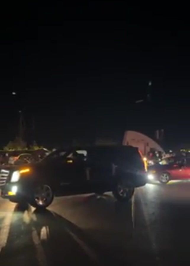 At night, several cars are gathered on a paved area, illuminated by the headlights of the vehicles and some overhead lights. A black SUV with bright headlights is seen to the left of the frame. In the background, a semi-trailer is partly visible. As the camera pans right, a red car comes into view, followed by a white pickup truck with glowing headlights. Other vehicles are parked nearby, with people standing around them. The general scene suggests an informal gathering or event at night.