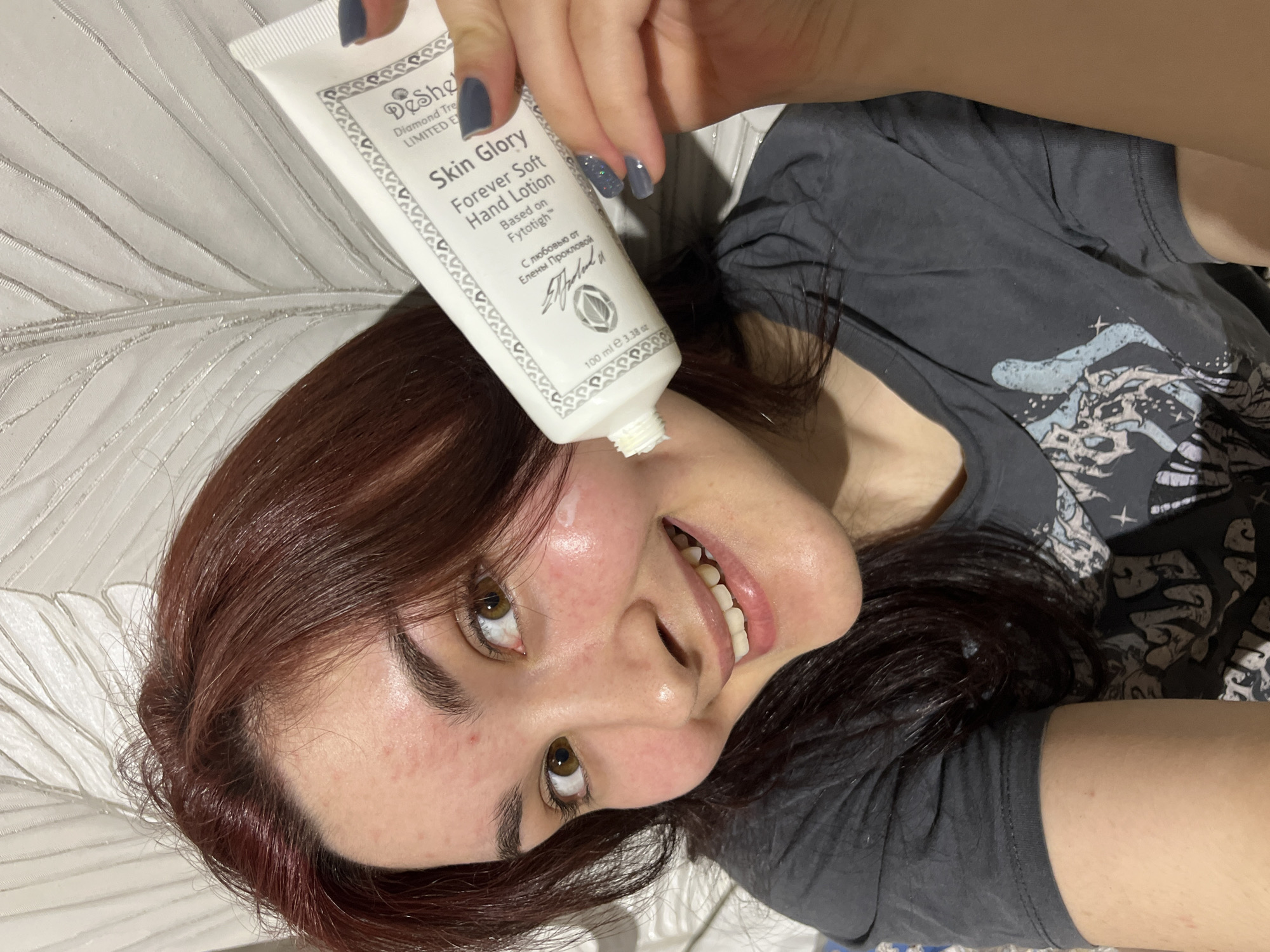 A woman with auburn hair and hazel eyes is lying down, holding a tube of Desheli Skin Glory Forever Soft Hand Lotion. She is smiling and appears to be applying the lotion to her face. She is wearing a gray t-shirt and has dark blue nail polish. The background is a white patterned surface. The lotion is advertised as being “С любовью от Елены Прокловой,” or “with love from Elena Proklova,” implying it may be endorsed by the Russian actress. There is no information in the image that specifies that this image was taken in the city of Neftekamsk, Russia.