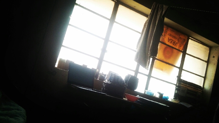 The image displays an interior room in Rijiyar Zaki, Nigeria, viewed towards a brightly lit window. The scene is strongly backlit, silhouetting the interior objects against the daylight visible through the window. The window features a grid of multiple panes and a dark frame. A dark cloth or garment is draped over the top right section of the window frame. Partially obscuring one of the upper right window panes is a large yellow or orange bag, bearing the visible text "UREA HARVEST". Below the window, a dark surface, likely a table or shelf, extends across its width. Upon this surface, from left to right, are a dark, rectangular object resembling a laptop or monitor, several smaller containers or items, a red bowl, and a stack of papers or a similar object on the far right. No people are visible. The room's interior, aside from the illuminated window and its immediate vicinity, remains largely in shadow.