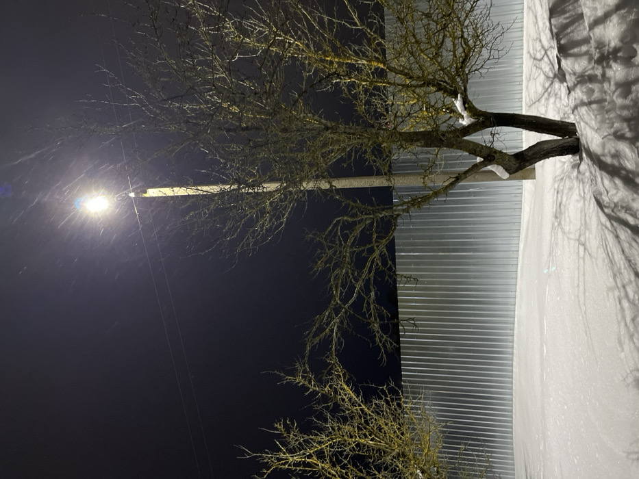 A tree with bare branches stands beside a corrugated metal wall, partially covered in snow. A street lamp casts a bright light through the branches. The sky is dark, hinting at night. Some snow can be seen on the tree branches. The shadow of the tree can be seen on the wall.