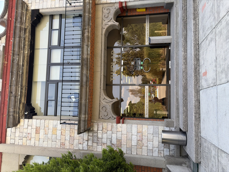An exterior shot of a building features a window with a black metal ladder and a glass-door entrance. The architecture combines stone and brickwork, with ornate carved details above the entrance. Reflective glass doors display the word "TUDLAB" and "Tecnologias de la Informacion". A green shrub is visible at the bottom, adding a natural element to the scene.