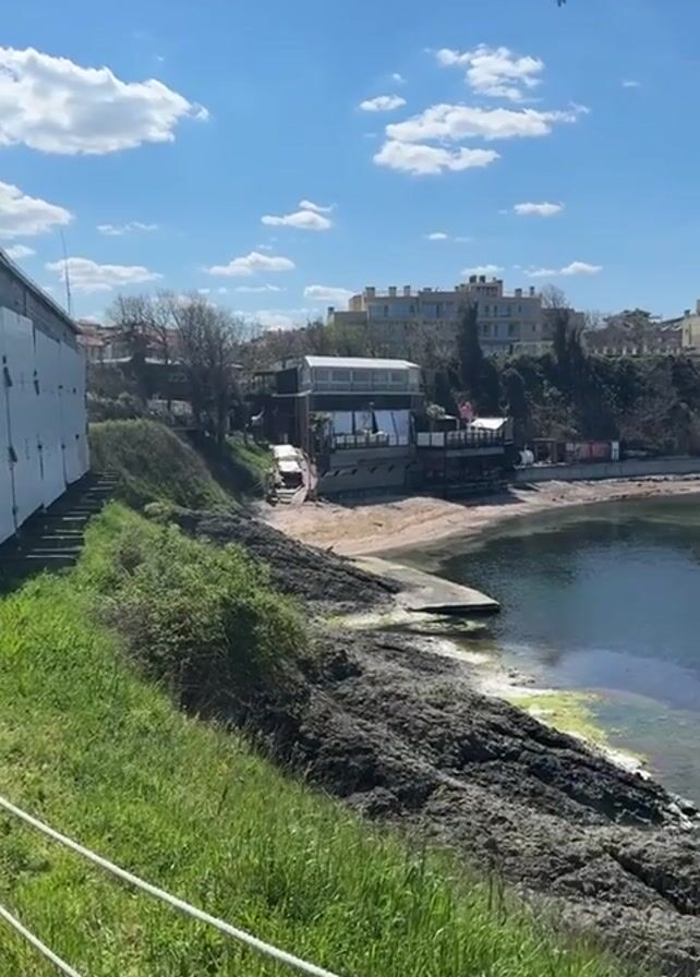 The camera pans across a coastal scene on a sunny day with a few clouds in the blue sky. In the foreground is a grassy bank with a white rope fence. To the left is a white, one-story building with multiple closed doors. The camera pans right to show a small, sandy beach nestled in a cove. A restaurant or bar with a glass-enclosed area sits above the beach. A white vehicle is parked in front. The water is clear and calm with visible seaweed and rocks. A small, concrete pier extends into the water. In the background, several light-colored buildings are situated atop a cliff overlooking the cove. Some birds fly in the sky.
